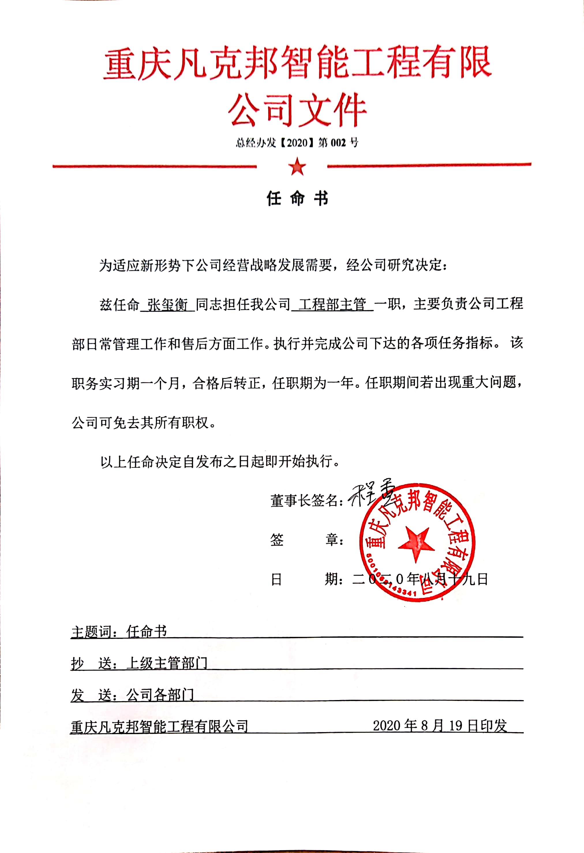 任命張璽衡任我公司工程部主管