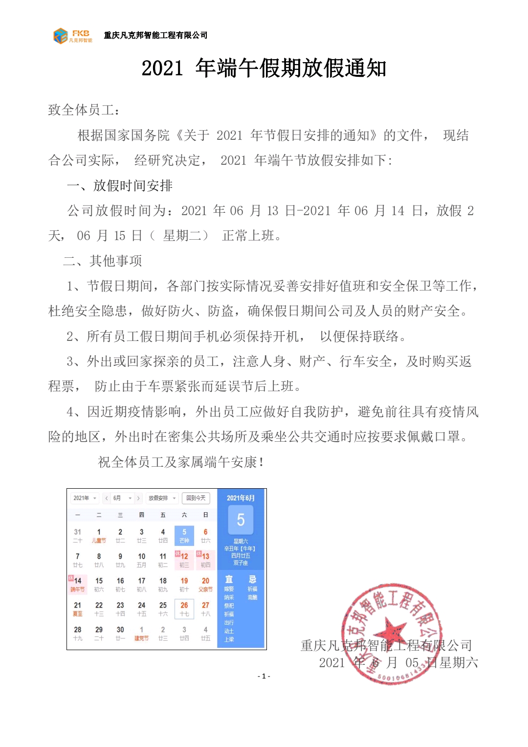 公司放假時間為:2021年6月13日-6月14日,放假2天,6月15日(星期二)正常上班。