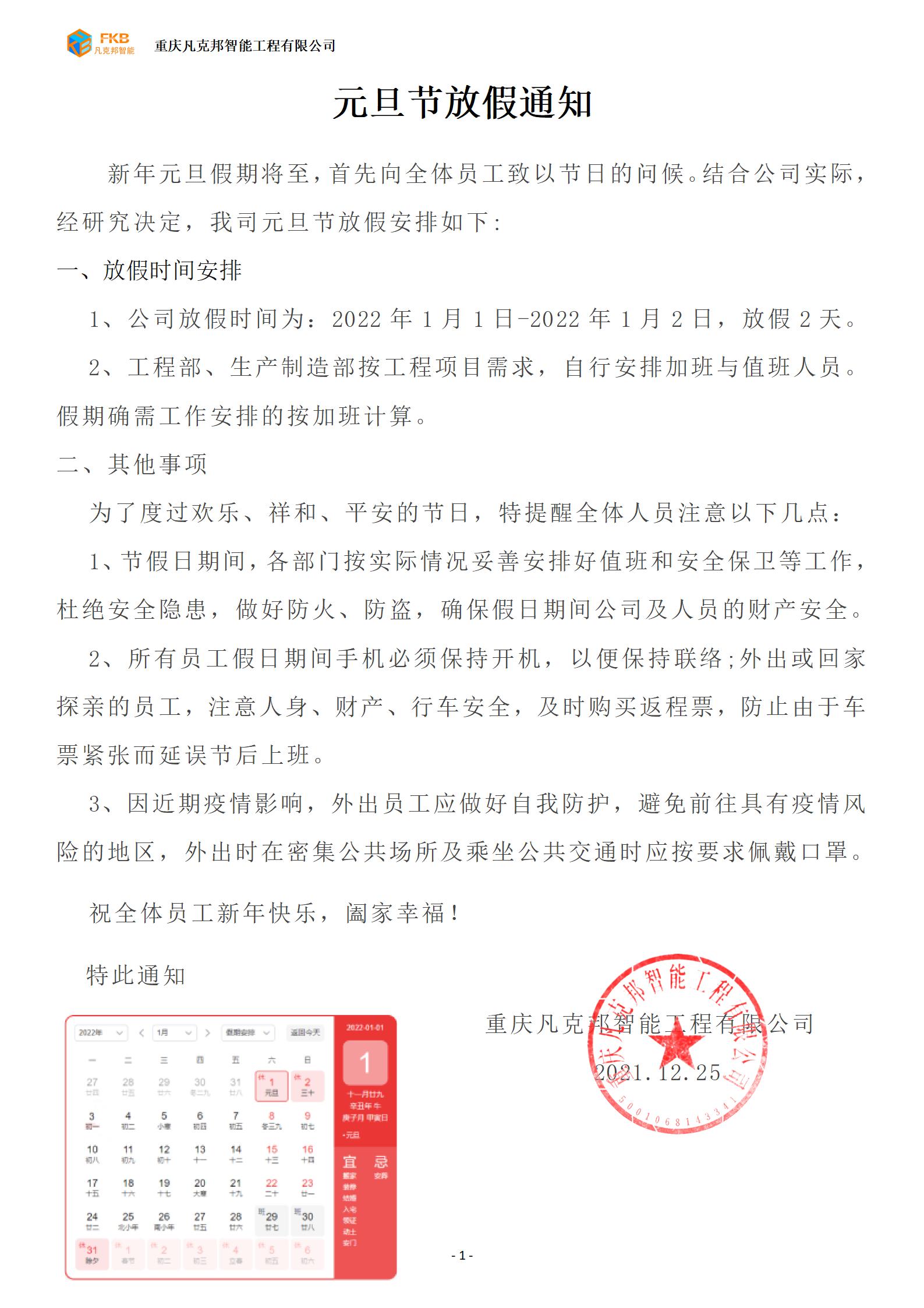2022年元旦節(jié)放假通知,公司放假時間為:2022年1月1日-1月2日,放假2天。