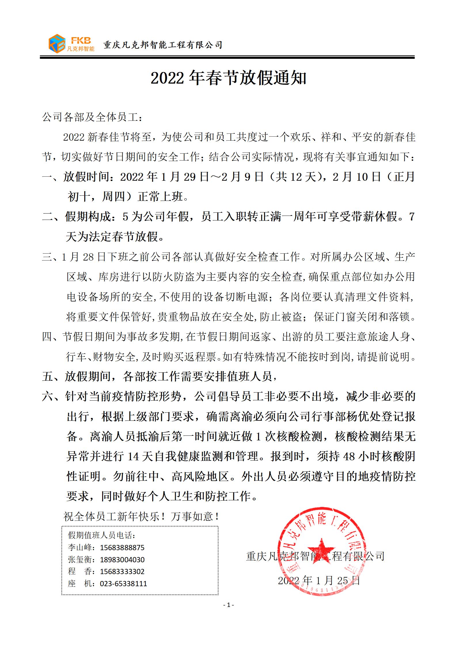 放假時(shí)間:2022年1月29日-2月9日(共12天),2月10日(正月初十,周四)正常上班。